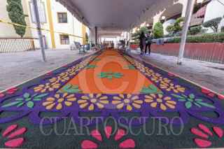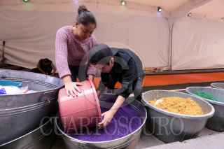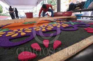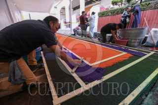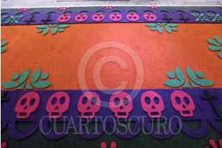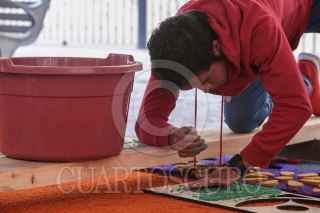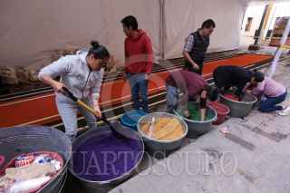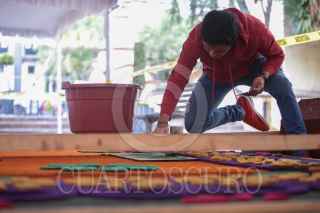 TOLUCA, ESTADO DE MÉXICO, 18OCTUBRE2019.- El maestro artesano Tomas Velázquez y su equipo trabajan en un tapete monumental por el Día de Muertos que medirá 30 metros de largo por 2.50 metros de ancho, utilizando aserrín de colores, estará instalado en el corredor entre la iglesia Sabta Veracruz y los Portales de Toluca, esto como parte de las actividades del Festival del Alfeñique en Toluca. FOTO: CRISANTA ESPINOSA AGUILAR /CUARTOSCURO.COM