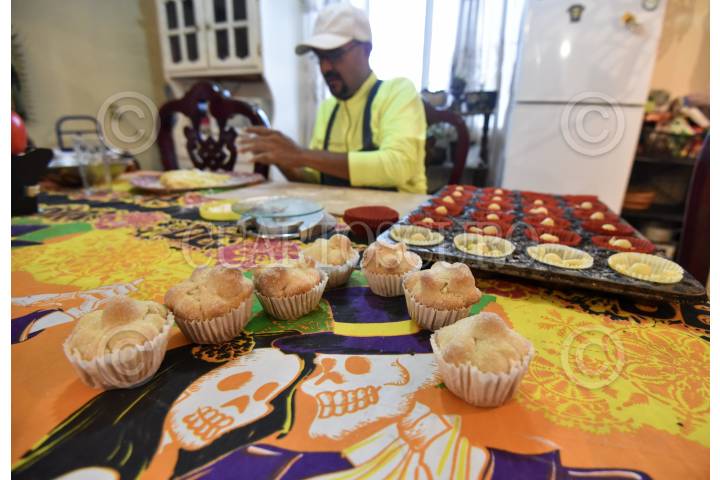 TOLUCA, ESTADO DE MÉXICO, 21OCTUBRE2019.- Desde hace tres años Eduardo Limón y su esposa Brenda Naranjo preparan las mantehojaldras o mantemuertas, inspiradas en las manteconchas, ellos comienzan sus ventas desde el 17 de septiembre pero conforme se acerca la celebración del Día de Muertos los pedidos aumentan, llegando a hacer más de tres mil piezas, los ingredientes de este pan son los mismos para elaborar un pan de muerto solo que va en un capacillo de papel, cada pieza cuesta 6 pesos y las rellenas 7 pesos, llegan a vender en algunos bazares de la ciudad de Toluca. FOTO: CRISANTA ESPINOSA AGUILAR /CUARTOSCURO.COM