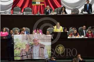 CIUDAD DE MÉXICO, 22OCTUBRE2019.- María Luisa Albores, secretaria de BIENESTAR, durante asistió a comparecer ante el pleno de la Cámara de Diputados, en el que se somete a discusión el Primer Informe de Gobierno Federal. En la imagen, Abril Alcalá Padilla, diputada del PRD, en compañia de diputados de su grupo parlamentario protestó en contra de la secretaria María Luisa Albores. FOTO: MARIO JASSO /CUARTOSCURO.COM