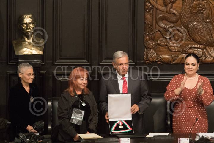 CIUDAD DE MÉXICO, 23OCTUBRE2019.- Rosario Ibarra de Piedra, fundadora del Comité Eureka, recibió la medalla Belisario Domínguez por parte del Senado. Recibieron el reconocimiento sus hijas Claudia Piedra Ibarra y Rosario Piedra Ibarra. En el acto estuvieron presentes Andrés Manuel López Obrador, Presidente de México, y Mónica Fernández, presidenta del Senado. FOTO: MOISÉS PABLO /CUARTOSCURO.COM