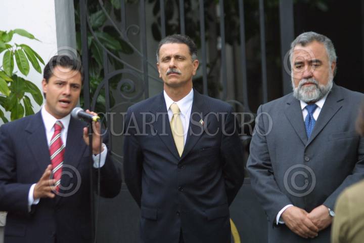 MEXICO D.F. 21SEPTIEMBRE2005.- Enrique Peña Nieto, Gobernador de Estado de Mexico, Carlos Abascal Secretario de Gobernacion y Alejandro Encinas Jefe del Gobierno Distrito Federal. durante la conferencia ofrecieron en la Secretaria de Gobernacion. FOTO: Fernando Garcia/CUARTOSCURO.COM