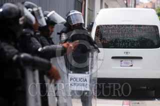 CUERNAVACA, MORELOS, 24OCTUBRE2019.- Policías de Morelos con equipo antimotines llegan a la sede del Congreso local como medida de disuasión. Habitantes del municipio indígena de Hueyapan mantienen tomado el edificio a fin de que el alcalde de Tetela del Volcán firme el convenio de delimitación territorial y les sea entregada la clave de creación, ya que sin el código geoestadístico no puede ser reconocido por el gobierno federal para que le sean asignados recursos. FOTO: MARGARITO PÉREZ RETANA /CUARTOSCURO.COM