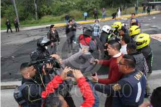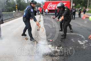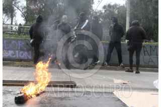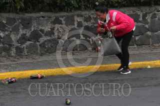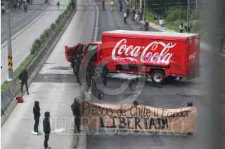 CIUDAD DE MÉXICO, 24OCTUBRE2019.- Jóvenes embozados se manifestaron por la libertad de los presos políticos de Chile y Ecuador sobre avenida Insurgentes, cerrando la circulación de ambos sentidos, entre sus acciones de protestas vandalizaron dos camiones repartidores de dulces y de refrescos. Al final llegaron policías capitalinos para apagar las fogatas que los embozados habían prendido, y personas que iban pasando aprovecharon para llevarse los refrescos que estaban tirados. FOTO: ROGELIO MORALES /CUARTOSCURO.COM