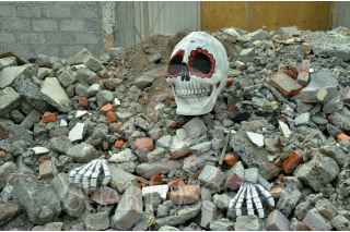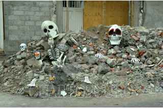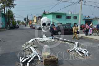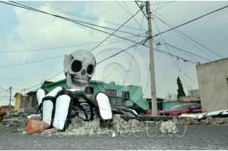 CIUDAD DE MÉXICO, 28OCTUBRE2019.- Los muertos emergieron del Mictlan y se instalaron a las afueras de domicilio de su creador Raymundo Medina. La calle Francisco Santiago Borra en la colonia Santa Cecilia se convirtió en la calle más visitada de la alcaldía Tláhuac, donde dos calaveras de dos y hasta cuatro metros acercan a los habitantes al tradicional Día de Muertos. FOTO: ARMANDO MONROY /CUARTOSCURO.COM