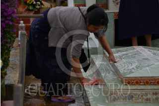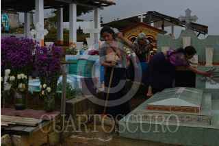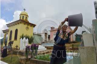 ZINACANTÁN, CHIAPAS, 31OCTUBRE2019.- Familias de la comunidad asisten al panteón de la cabecera municipal para iniciar los preparativos de la celebración del día de muertos. En el panteón se lavan las tumbas y otras familias también restauran las edificaciones que albergan a sus familiares fallecidos, para recibirlos con flores y música la noche de su visita. FOTO: ISABEL MATEOS /CUARTOSCURO.COM