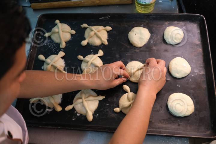 CIUDAD DE MÉXICO, 31OCTUBRE2019.- Para la elaboración tradicional de pan de muerto primero se bate la masa que está hecha a base de huevo, margarina, sal, levadura y ralladura de naranja; después se realiza la boleada y la engrasada; posteriormente se le colocan las canillas, las cuales están hechas a base de una masa hecha de más levadura, azúcar y huevo; se deja secar la preparación de la masa durante 15 minutos y se meten al horno de 20 a 30 minutos y finalmente al estar horneado el pan, se coloca el azúcar. El proceso dura aproximadamente 2 horas. FOTO: GRACIELA LÓPEZ /CUARTOSCURO.COM