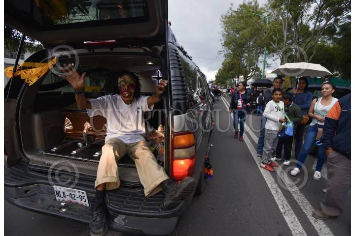 TOLUCA, ESTADO DE MÉXICO, 01NOVIEMBRE2019.- Funerarias Unidas Del Valle de Toluca desfilaron por la ciudad con algunos ataúdes y carrozas fúnebres y disfraces alusivos a la fecha, como parte de los festejos del Día de Muertos. FOTO: CRISANTA ESPINOSA AGUILAR /CUARTOSCURO.COM