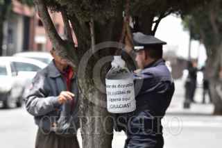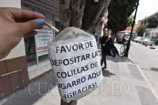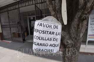 TOLUCA, ESTADO DE MÉXICO, 04OCTUBRE2019.- En busca de concientizarse a la sociedad algunas personas colocaron botes en árboles de la calle Nigromante con la leyenda “Favor de depositar las colillas de cigarro aquí” improvisando colectores como una forma de evitar las sigan tirando en la calle y continúen contaminando. FOTO: CRISANTA ESPINOSA AGUILAR /CUARTOSCURO.COM
