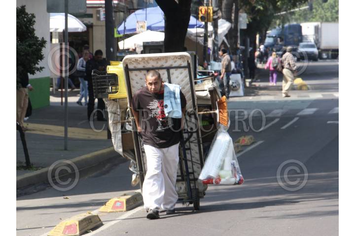 CIUDAD DE MÉXICO, 05NOVIEMBRE.- Un comerciante transporta su puesto ambulante en un diablito por las calles de la alcaldía Cuahutemoc. Según la Cámara Nacional de Comercio, el ambulantaje genera el 40% del Producto Interno Bruto en la ciudad. FOTO: ROGELIO MORALES /CUARTOSCURO.COM
