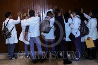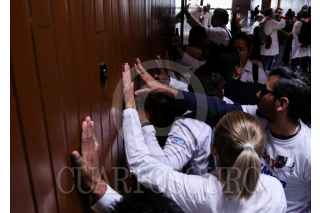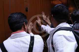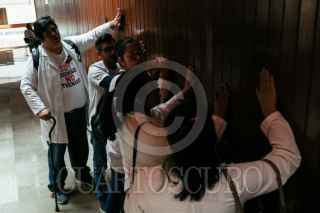 CIUDAD DE MÉXICO, 05NOVIEMBRE2019.- Químicos integrantes del Movimiento Nacional de Químicos protestan a las afueras del salón Verde de la Cámara de Diputados, durante la reunión de la Comisión de Presupuesto con la subsecretaria de Egresos de Hacienda, Victoria Rodríguez Ceja. Demandaron la recodificación para ser identificados como químicos y no como técnicos, así como el cumplimiento sobre sus prestaciones como profesionistas. FOTO: GALO CAÑAS /CUARTOSCURO.COM