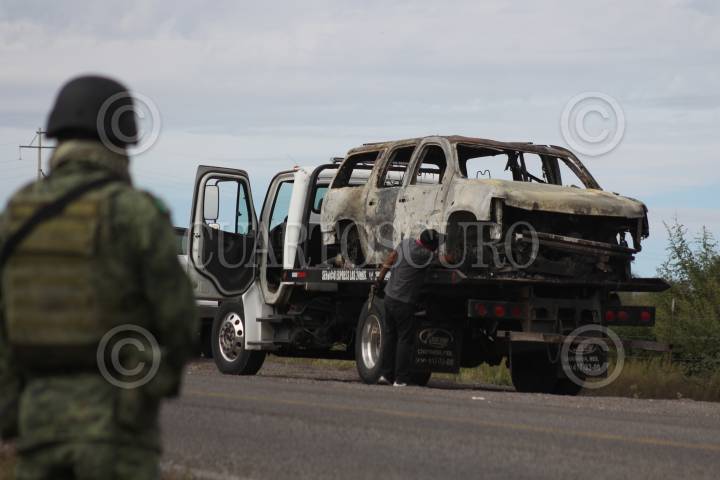 BAVISPE, SONORA, 06NOVIEMBRE2019.- Peritos de la Fiscalía de Sonora levantaron el automóvil calcinado en donde fueron asesinados varios miembros de la Falimia LeBarón, quien sufrió un ataque armado cuando viajaban en caravana por la zona a manos de un grupo armado, elementos de la Guardia Nacional mantienen presencia en la zona, por la mañana autoridades federales señalaron como a los probables responsables a integrantes del grupo criminal La Línea. FOTO: NACHO RUIZ /CUARTOSCURO.COM