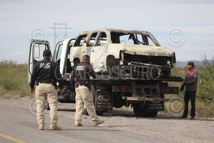 BAVISPE, SONORA, 06NOVIEMBRE2019.- Peritos de la Fiscalía de Sonora levantaron el automóvil calcinado en donde fueron asesinados varios miembros de la Falimia LeBarón, quien sufrió un ataque armado cuando viajaban en caravana por la zona a manos de un grupo armado, elementos de la Guardia Nacional mantienen presencia en la zona, por la mañana autoridades federales señalaron como a los probables responsables a integrantes del grupo criminal La Línea. FOTO: NACHO RUIZ /CUARTOSCURO.COM
