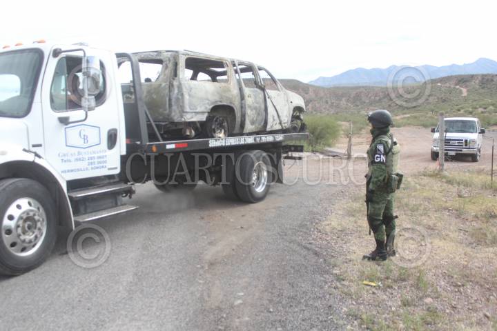 BAVISPE, SONORA, 06NOVIEMBRE2019.- Peritos de la Fiscalía de Sonora levantaron el automóvil calcinado en donde fueron asesinados varios miembros de la Falimia LeBarón, quien sufrió un ataque armado cuando viajaban en caravana por la zona a manos de un grupo armado, elementos de la Guardia Nacional mantienen presencia en la zona, por la mañana autoridades federales señalaron como a los probables responsables a integrantes del grupo criminal La Línea. FOTO: NACHO RUIZ /CUARTOSCURO.COM