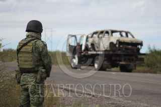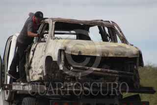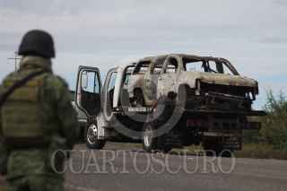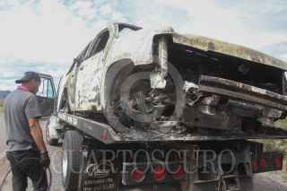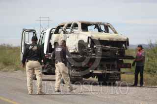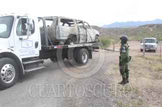 BAVISPE, SONORA, 06NOVIEMBRE2019.- Peritos de la Fiscalía de Sonora levantaron el automóvil calcinado en donde fueron asesinados varios miembros de la Falimia LeBarón, quien sufrió un ataque armado cuando viajaban en caravana por la zona a manos de un grupo armado, elementos de la Guardia Nacional mantienen presencia en la zona, por la mañana autoridades federales señalaron como a los probables responsables a integrantes del grupo criminal La Línea. FOTO: NACHO RUIZ /CUARTOSCURO.COM