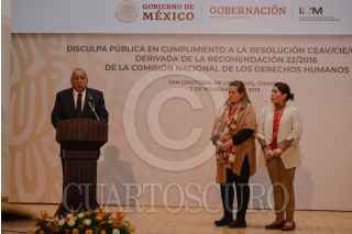 SAN CRISTOBAL DE LAS CASAS, CHIAPAS, 07NOVIEMBRE2019.- El titular del Instituto Nacional de Migración Francisco Garduño Yáñez ofreció una disculpa publica a cuatro indigenas detenidos y torturados por agentes del INM en Sonora en el año 2015, las personas agredidas prefirieron resguardar su identidad. Una de las peticiones que tenían los agredidos era que se hiciera publico el castigo y acciones que tomó el INM ante esta violación a los derechos humanos. La disculpa leída por el titular de la institución mencionó que como máximo fueron suspendidos 30 días de sus labores, capacitación en materia de derechos humanos y promover que no se repitan estas acciones en el futuro. El evento se llevó a cabo en el Teatro de Bellas Artes ubicado en la cabecera municipal. FOTO: ISABEL MATEOS /CUARTOSCURO.COM