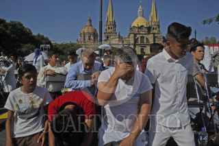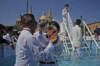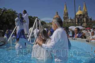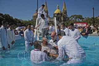 GUADALAJARA, JALISCO, 10NOVIEMBRE2019.- En las inmediaciones de la Plaza de la Liberación cientos de personas de la Congregación de la Luz del Mundo realizaron una jornada de Bautizos colectivos, un evento que por primera vez se realiza fuera de las sedes donde acostumbran realizarlos. FOTO: FERNANDO CARRANZA GARCIA /CUARTOSCURO.COM