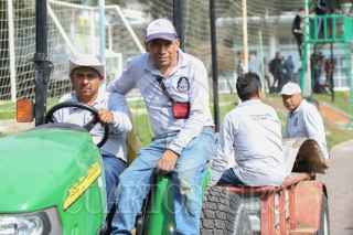 CIUDAD DE MÉXICO, 11NOVIEMBRE2019.- La Selección Mexicana de futbol realizo entrenamiento de regeneración en las instalaciones del Centro de Alto Rendimiento, esto previo al encuentro contra su similar de Panamá. En imagen trabajadores de mantenimiento de las canchas del CAR recorren los pasillos sobre un tractor. FOTO: ROGELIO MORALES /CUARTOSCURO.COM