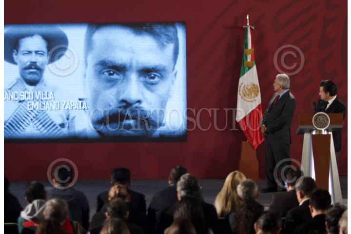 CIUDAD DE MÉXICO, 12NOVIEMBRE2019.- Olga Sánchez Cordero Dávila, secretaria de Gobernación; Luis Cresencio Sandoval González, secretario de la Defensa Nacional; José Rafael Ojeda Durán; secretario de la Marina y Alejandra Frausto Guerrero, secretaria de Cultura, durante la conferencia matutina diaria para responder preguntas a los medios de comunicación en el Palacio Nacional. FOTO: ANDREA MURCIA /CUARTOSCURO.COM