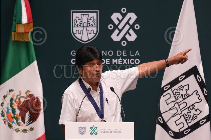 CIUDAD DE MÉXICO, 13NOVIEMBRE2019.- Claudia Sheinbaum, jefa de Gobierno, y Rafael Guerra Álvarez, presidente del Tribunal Superior de Justicia de la Ciudad de México, se despiden de Evo Morales, ex presidente de Bolivia, al terminar la ceremonia de la entrega de la distinción de "Huésped Distinguido". El acto se realizó en el patio del Antiguo Palacio del Ayuntamiento. FOTO: GRACIELA LÓPEZ /CUARTOSCURO.COM