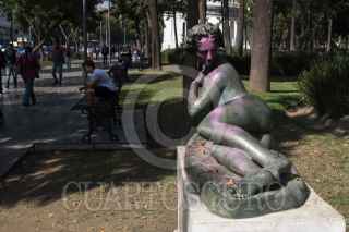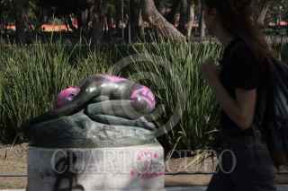 CIUDAD DE MÉXICO, 26NOVIEMBRE2019.- Varias esculturas que se encuentran en la Alameda Central se observan pintadas de rosa, el día de ayer fueron grafiteadas con pintura en aerosol durante la marcha de mujeres que exigen el cese de la violencia hacia las mujeres en el país. FOTO: MOISÉS PABLO /CUARTOSCURO.COM