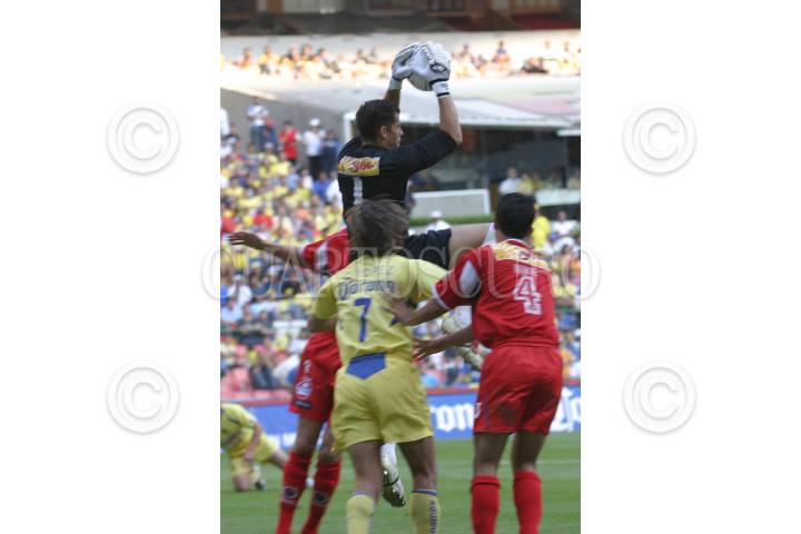 MEXICO, D. F. 23OCTUBRE2005.- Kleber Boas del América se disputa un balón con un jugador del Veracruz en partido disputado en el estadio Azteca. Los tiburones vencieron 2-1 al América. FOTO: Nelly Salas/CUARTOSCURO.COM