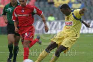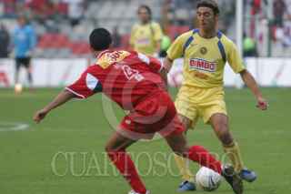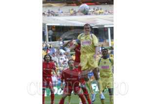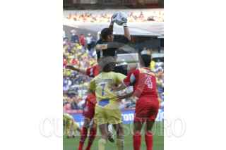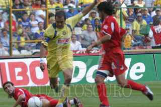MEXICO, D. F. 23OCTUBRE2005.- Kleber Boas del América se disputa un balón con un jugador del Veracruz en partido disputado en el estadio Azteca. Los tiburones vencieron 2-1 al América. FOTO: Nelly Salas/CUARTOSCURO.COM