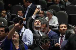 CIUDAD DE MÉXICO, 28NOVIEMBRE2019.- Se aprobó el dictamen de la Comisión de Cultura y Cinematografía en materia de Derechos de Autor durante la Sesion Ordinaria en la Cámara de Diputados. En la imagen, Sergio Mayer, presidente de la Comisión de Cultura y Cinematografía, le toma una fotografía al tablero el cual se aprobó con 411 votos a favor. FOTO: GRACIELA LÓPEZ /CUARTOSCURO.COM