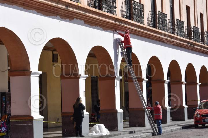 TOLUCA, ESTADO DE MÉXICO, 29NOVIEMBRE2019.- Trabajadores del ayuntamiento pintan de color blanco los Portales de Toluca como parte de la nueva imagen de los mismos. FOTO: CRISANTA ESPINOSA AGUILAR /CUARTOSCURO.COM