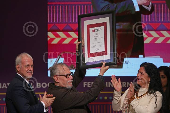GUADALAJARA, JALISCO, 30NOVIEMBRE2019.- David Huerta escritor Mexicano, recibió el Premio FIL de Literatura en Lengua Romances en la inauguración de la edición 32 de la Feria Internacional del Libro de Guadalajara en la expo, en donde como país invitado es la India y en la que estuvieron presentes Raúl Padilla López presidente del Patronato de la FIL, Alejandra Frausto Secretaria de Cultura de México, Sanjay Dhotre Representante de la India, el Gobernador del Estado Enrique Alfaro Ramírez entre otras personalidades. FOTO: FERNANDO CARRANZA GARCIA / CUARTOSCURO.COM