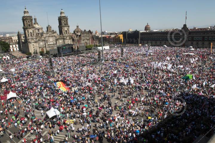 CIUDAD DE MÉXICO, 01DICIEMBRE2019.- Una bandera multicolor con el moño rojo alusivo a la lucha mundial contra el VIH lució en el mitin político que encabezó Andrés Manuel López Obrador, Presidente de México, por su 1 Informe de Gobierno realizado en el Zócalo. FOTO: MOISÉS PABLO /CUARTOSCURO.COM