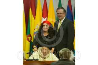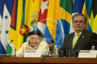 Se realizó la clausura del Encuentro Latinoamericano “México ante los extremismos: el valor de la cultura frente el odio”, en dónde participó del poeta Ernesto Cardenal, que se realizó en el Salón José María Morelos y Pavón de la SRE. Lo acompaño el canciller Marcelo Ebrard y Alejandra Frausto, secretaria de Cultura. FOTO: CUARTOSCURO.COM