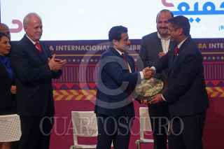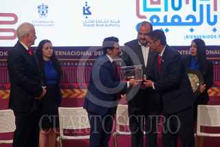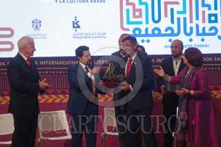 Ahmed AL Ameri Presidente de la Autoridad del Libro de Sharja y Manpreet Vohra Embajador de la India en México intercambian presentes en el cambio de estafeta para el edición 34 de la Feria Internacional del Libro de Guadalajara, en donde como país invitado de honor es Sharja y la Cultura Árabe. FOTO: FERNANDO CARRANZA GARCIA / CUARTOSCURO.COM