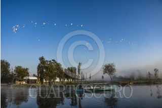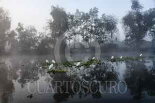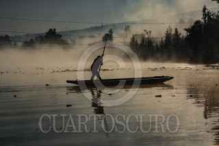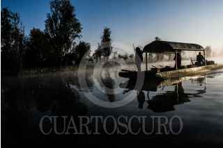 Entre una intensa neblina los chinamperos amanecieron este día, entre los canales aún se observan varias especies de aves, aunque uno de los principales atractivos turísticos de Xochimilco para la gente que acude s esta alcaldía es un paseo por trajinera, muchos de los habitantes cercanos a los canales aún utilizan sus embarcaciones para el transporte de mercancía como lo hicieron las culturas prehispánicas hace cientos de años. FOTO: ELIZABETH RUIZ/CUARTOSCURO.COM
