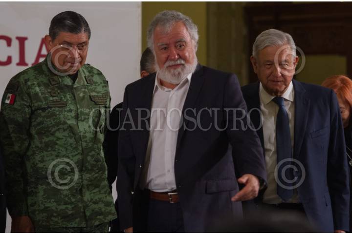 Andrés Manuel López Obrador, presidente de México, acompañado de Alejandro Encinas Rodríguez, subsecretario de Derechos Humanos, Población y Migración de la Secretaría de Gobernación (Segob); Alfonso Durazo Montaño, secretario de Seguridad y Protección Ciudadana; Luis Cresencio Sandoval González, secretario de la Defensa Nacional; José Rafael Ojeda Durán, secretario de Marina; Rosario Piedra Ibarra, presidenta de la Comisión Nacional de los Derechos Humanos (CNDH), durante la entrega del Premio Nacional de Derechos Humanos 2019, los ganadores fueron: Obtilia Eugenio Manuel; Modesta Chávez de la Rosa, viuda de Margarito Díaz González, ganador de la Mención Honorífica post mortem y Gabriela Díaz Chávez, hija de Margarito Díaz Chávez, ganador de la Mención Honorífica post mortem. La premiación se llevó a cabo en el Palacio Nacional. FOTO: ANDREA MURCIA /CUARTOSCURO.COM