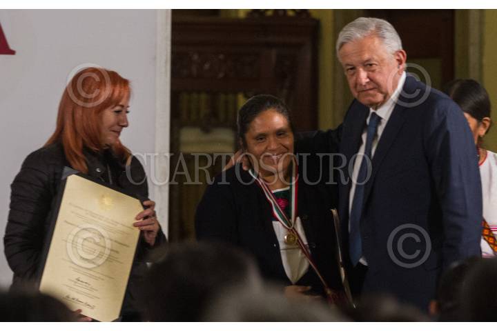 Andrés Manuel López Obrador, presidente de México, acompañado de Alejandro Encinas Rodríguez, subsecretario de Derechos Humanos, Población y Migración de la Secretaría de Gobernación (Segob); Alfonso Durazo Montaño, secretario de Seguridad y Protección Ciudadana; Luis Cresencio Sandoval González, secretario de la Defensa Nacional; José Rafael Ojeda Durán, secretario de Marina; Rosario Piedra Ibarra, presidenta de la Comisión Nacional de los Derechos Humanos (CNDH), durante la entrega del Premio Nacional de Derechos Humanos 2019, los ganadores fueron: Obtilia Eugenio Manuel; Modesta Chávez de la Rosa, viuda de Margarito Díaz González, ganador de la Mención Honorífica post mortem y Gabriela Díaz Chávez, hija de Margarito Díaz Chávez, ganador de la Mención Honorífica post mortem. La premiación se llevó a cabo en el Palacio Nacional. FOTO: ANDREA MURCIA /CUARTOSCURO.COM