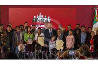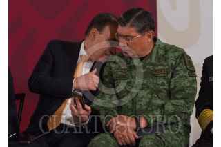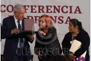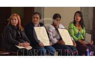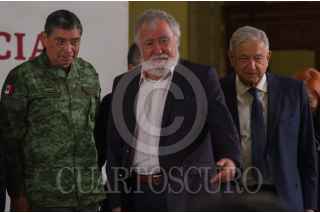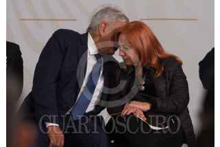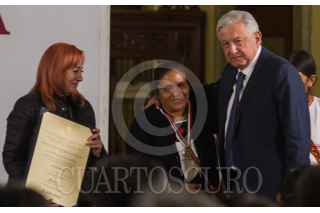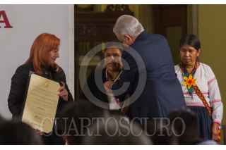 Andrés Manuel López Obrador, presidente de México, acompañado de Alejandro Encinas Rodríguez, subsecretario de Derechos Humanos, Población y Migración de la Secretaría de Gobernación (Segob); Alfonso Durazo Montaño, secretario de Seguridad y Protección Ciudadana; Luis Cresencio Sandoval González, secretario de la Defensa Nacional; José Rafael Ojeda Durán, secretario de Marina; Rosario Piedra Ibarra, presidenta de la Comisión Nacional de los Derechos Humanos (CNDH), durante la entrega del Premio Nacional de Derechos Humanos 2019, los ganadores fueron: Obtilia Eugenio Manuel; Modesta Chávez de la Rosa, viuda de Margarito Díaz González, ganador de la Mención Honorífica post mortem y Gabriela Díaz Chávez, hija de Margarito Díaz Chávez, ganador de la Mención Honorífica post mortem. La premiación se llevó a cabo en el Palacio Nacional. FOTO: ANDREA MURCIA /CUARTOSCURO.COM