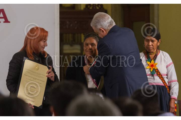 Andrés Manuel López Obrador, presidente de México, acompañado de Alejandro Encinas Rodríguez, subsecretario de Derechos Humanos, Población y Migración de la Secretaría de Gobernación (Segob); Alfonso Durazo Montaño, secretario de Seguridad y Protección Ciudadana; Luis Cresencio Sandoval González, secretario de la Defensa Nacional; José Rafael Ojeda Durán, secretario de Marina; Rosario Piedra Ibarra, presidenta de la Comisión Nacional de los Derechos Humanos (CNDH), durante la entrega del Premio Nacional de Derechos Humanos 2019, los ganadores fueron: Obtilia Eugenio Manuel; Modesta Chávez de la Rosa, viuda de Margarito Díaz González, ganador de la Mención Honorífica post mortem y Gabriela Díaz Chávez, hija de Margarito Díaz Chávez, ganador de la Mención Honorífica post mortem. La premiación se llevó a cabo en el Palacio Nacional. FOTO: ANDREA MURCIA /CUARTOSCURO.COM