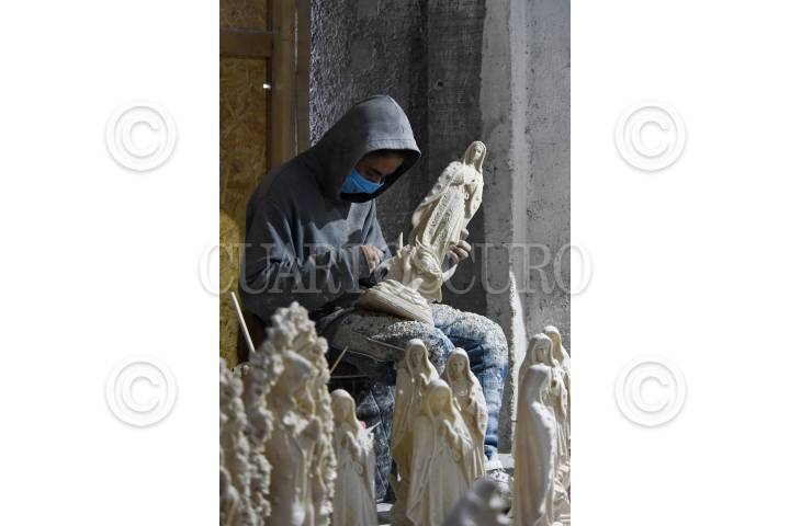 Liliana Flores dueña de Artesanias DMJ y originaria de San Andrés Cuexcontitlán lleva más de 15 años elaborando imágenes de la Virgen de Guadalupe de resina de todos los tamaños, al día pueden hacer hasta 80 piezas, trabajando todo el año, aunque en esta temporadas son más solicitadas a unos días del festejo de la Virgen Morena, son pintadas con aerógrafo una por una y Liliana se encarga de ello; sus piezas no solo se venden en la República Mexicana, tienen clientes en el extranjero, junto con su marido y 4 trabajadores más; esta delegación se caracteriza por el trabajo de la resina para elaborar desde figuras religiosas, máscaras, súper héroes, entre otros. FOTO: CRISANTA ESPINOSA AGUILAR /CUARTOSCURO.COM