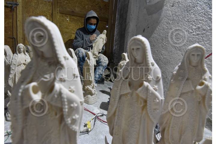 Liliana Flores dueña de Artesanias DMJ y originaria de San Andrés Cuexcontitlán lleva más de 15 años elaborando imágenes de la Virgen de Guadalupe de resina de todos los tamaños, al día pueden hacer hasta 80 piezas, trabajando todo el año, aunque en esta temporadas son más solicitadas a unos días del festejo de la Virgen Morena, son pintadas con aerógrafo una por una y Liliana se encarga de ello; sus piezas no solo se venden en la República Mexicana, tienen clientes en el extranjero, junto con su marido y 4 trabajadores más; esta delegación se caracteriza por el trabajo de la resina para elaborar desde figuras religiosas, máscaras, súper héroes, entre otros. FOTO: CRISANTA ESPINOSA AGUILAR /CUARTOSCURO.COM