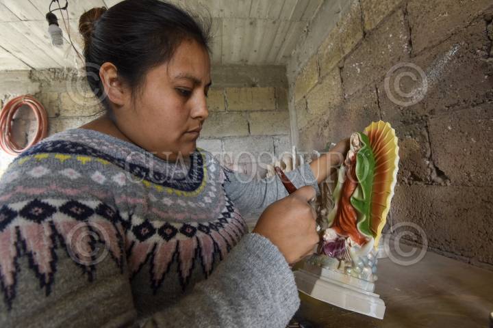 Liliana Flores dueña de Artesanias DMJ y originaria de San Andrés Cuexcontitlán lleva más de 15 años elaborando imágenes de la Virgen de Guadalupe de resina de todos los tamaños, al día pueden hacer hasta 80 piezas, trabajando todo el año, aunque en esta temporadas son más solicitadas a unos días del festejo de la Virgen Morena, son pintadas con aerógrafo una por una y Liliana se encarga de ello; sus piezas no solo se venden en la República Mexicana, tienen clientes en el extranjero, junto con su marido y 4 trabajadores más; esta delegación se caracteriza por el trabajo de la resina para elaborar desde figuras religiosas, máscaras, súper héroes, entre otros. FOTO: CRISANTA ESPINOSA AGUILAR /CUARTOSCURO.COM