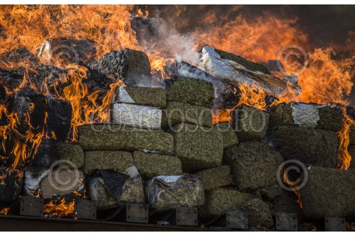 Más de 6 toneladas de drogas fueron incineradas en el 28 Batallón de Infantería de la Segunda Zona Militar, en el Aguaje de la Tuna. La mayoría de los estupefacientes destruidos fueron metanfetaminas, cocaína, marihuana y fentalino. En el acto estuvieron presentes autoridades militares, ministeriales y federales. FOTO: OMAR MARTÍNEZ /CUARTOSCURO.COM