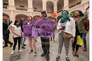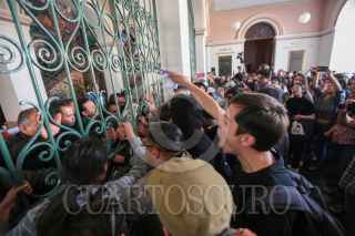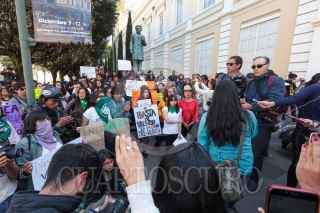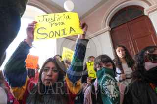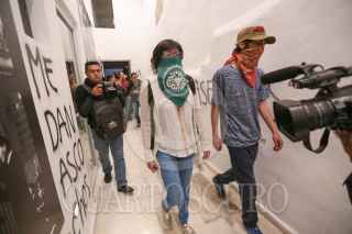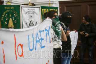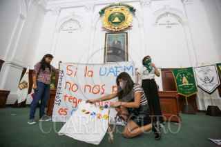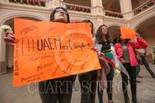 Al grito de justicia mujeres universitarias se manifestaron en el edifico de Rectoría de la UAEM exigiendo se esclarezca el asesinato de la maestra de danza Sonia Pérez, luego de que su cuerpo fuera encontrado en el Teatro de los Jaguares de la Universidad, exigen que la universidad tome medidas de seguridad para resguardar la integridad de las mujeres universitarias, gritaron consignas en el Patio del Cincuentenario y posteriormente tomaron el Aula Magna. FOTO: CRISANTA ESPINOSA AGUILAR/CUARTOSCURO.COM