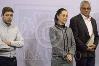 La jefa del Gobierno de la Ciudad, Claudia Sheinbaum, durante la conferencia a medios y lanzo el "Reto Verde". la acompañaron Eduardo Clarck y Rafael Obregón, se llevo acabo en el salón Francisco Zarco del Antiguo Palacio del Ayuntamiento. FOTO: VICTORIA VALTIERRA/CUARTOSCURO.COM