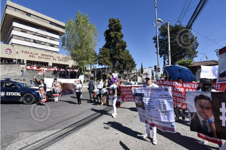 Familiares de personas desaparecidas se manifestaron en la Fiscalía General de Justicia del Estado de México exigiendo se investiguen los casos de sus familiares desaparecidos y de forma simbólica clausuraron el edificio, el cual fue protegido por vallas y policías ministeriales y estatales para evitar que los manifestantes lograran ingresar al inmueble. FOTO: CRISANTA ESPINOSA AGUILAR /CUARTOSCURO.COM