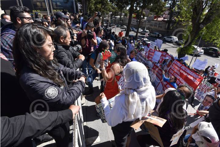 Familiares de personas desaparecidas se manifestaron en la Fiscalía General de Justicia del Estado de México exigiendo se investiguen los casos de sus familiares desaparecidos y de forma simbólica clausuraron el edificio, el cual fue protegido por vallas y policías ministeriales y estatales para evitar que los manifestantes lograran ingresar al inmueble. FOTO: CRISANTA ESPINOSA AGUILAR /CUARTOSCURO.COM