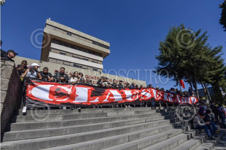 Familiares de personas desaparecidas se manifestaron en la Fiscalía General de Justicia del Estado de México exigiendo se investiguen los casos de sus familiares desaparecidos y de forma simbólica clausuraron el edificio, el cual fue protegido por vallas y policías ministeriales y estatales para evitar que los manifestantes lograran ingresar al inmueble. FOTO: CRISANTA ESPINOSA AGUILAR /CUARTOSCURO.COM