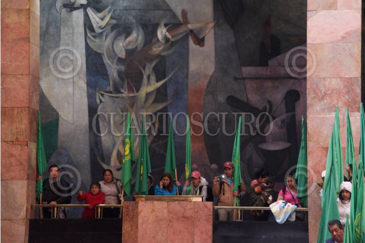 Decenas de integrantes de la Unidad Nacional de Trabajadores Agrícolas se manifestaron en el recinto de Bellas Artes para exigir que se retire la obra de Fabián Chávez en la que se muestra a un Zapata feminizado y que pertenece a la exposición “Emiliano, Zapata después de Zapata”. FOTO: MARIO JASSO /CUARTOSCURO.COM
