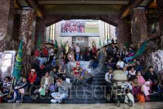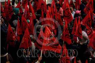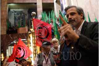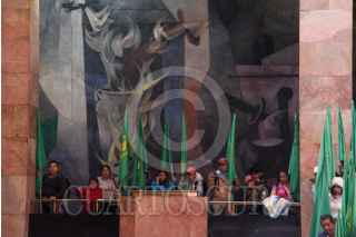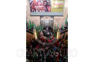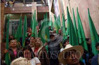 Decenas de integrantes de la Unidad Nacional de Trabajadores Agrícolas se manifestaron en el recinto de Bellas Artes para exigir que se retire la obra de Fabián Chávez en la que se muestra a un Zapata feminizado y que pertenece a la exposición “Emiliano, Zapata después de Zapata”. FOTO: MARIO JASSO /CUARTOSCURO.COM