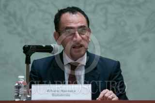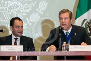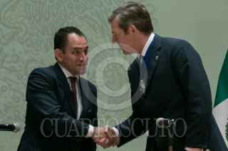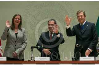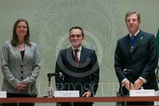 Conferencia de prensa encabezada por Arturo Herrera, secretario de Hacienda y Crédito Público, Corin Robertson, embajadora del Reino Unido de la Gran Bretaña en Irlanda del Norte en México, y William Russell, Alcalde Financiero de The City of London Corporation, donde se dieron detalles del Programa de Servicios Financiera del Fondo de Prosperidad, en Palacio Nacional.