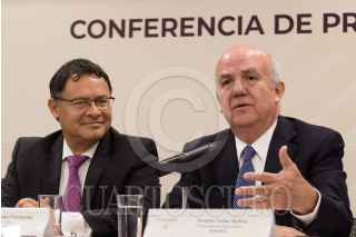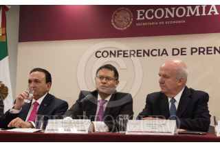 José Manuel López Campos, presidente de la Concanaco Servytur; Ernesto Acevedo Fernández, subsecretario de Economía, y Vicente Yáñez Solloa, presidente ejecutivo del ANTAD, ofrecieron una conferencia de prensa para dar el balance del "Buen Fin", al cual calificaron de positivó ya que sus ventas crecieron cerca de 4% respecto al año pasado. FOTO: MOISÉS PABLO/CUARTOSCURO.COM